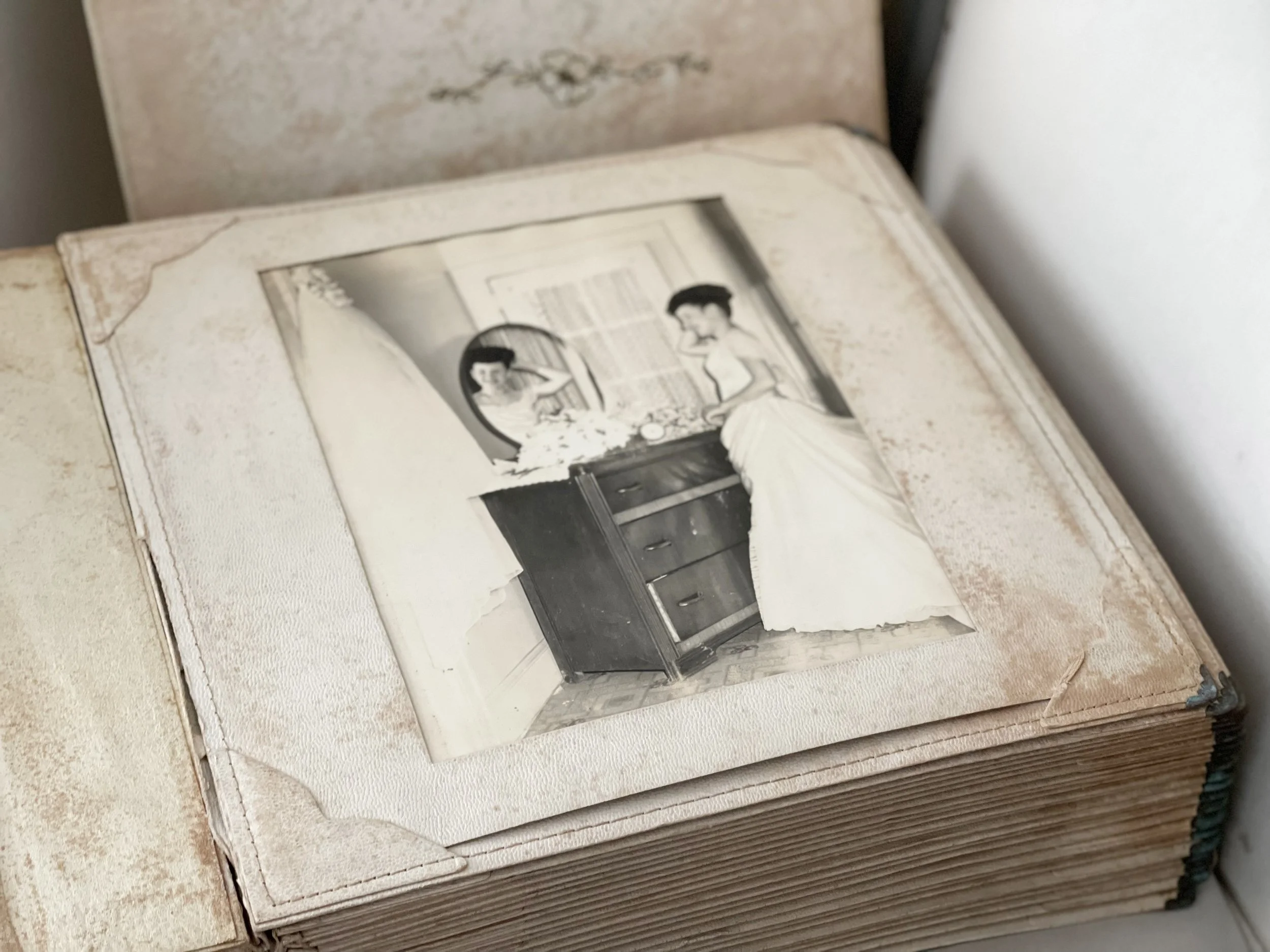 And then around the 1940s, wedding albums became much more common. But they were still built similarly to a scrap book with photo corners. But these photos were placed in a mat to give them a more polished look. 1940s wedding albums also included metal corners and leather covers.